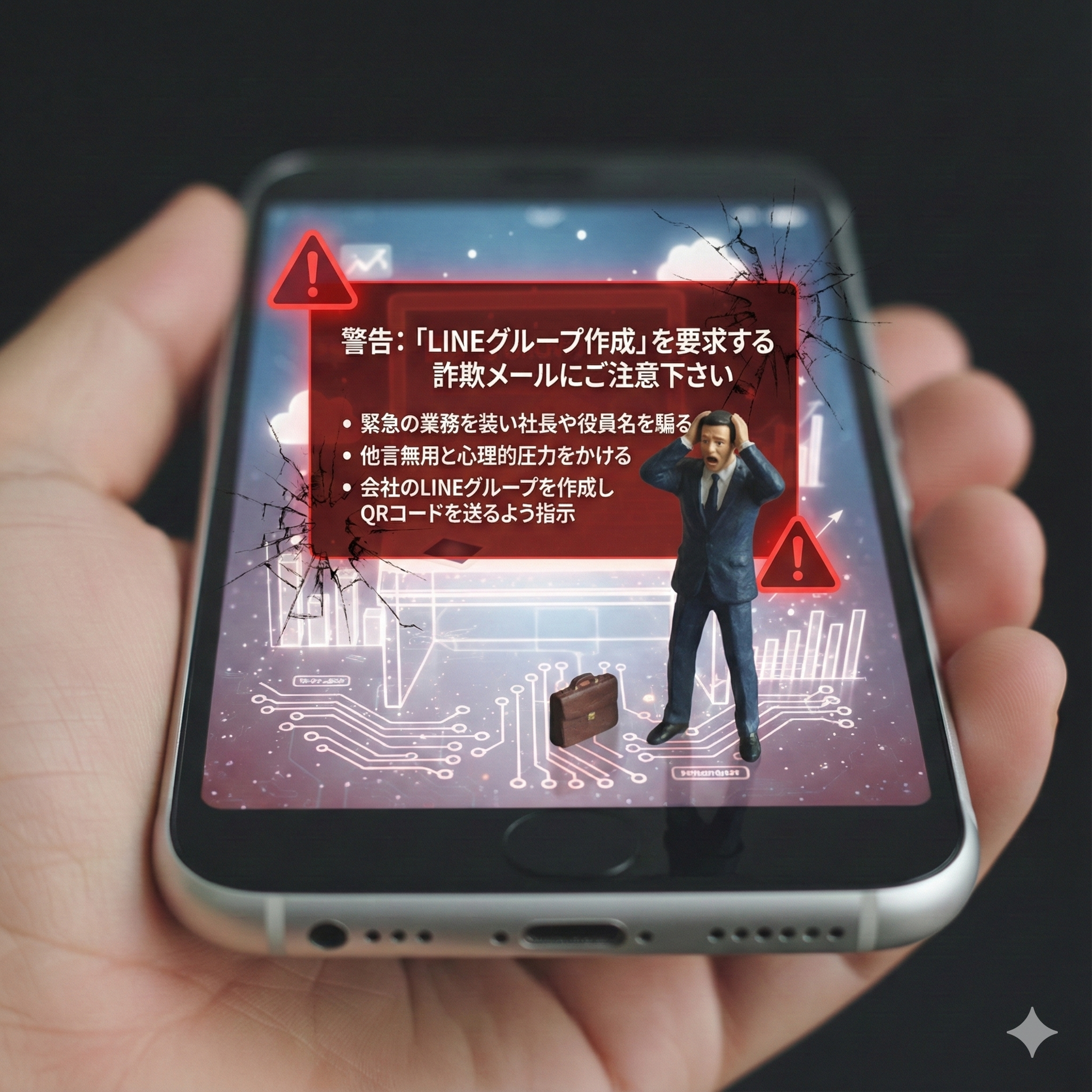 送り主に代表者や関係者を装うケースが多く見受けられ、「LINEグループの作成やQRコードの送付を業務として依頼する内容となっているようです。